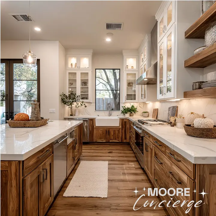 Thorough deep cleaning for kitchens and bathrooms, including inside fridge and oven.